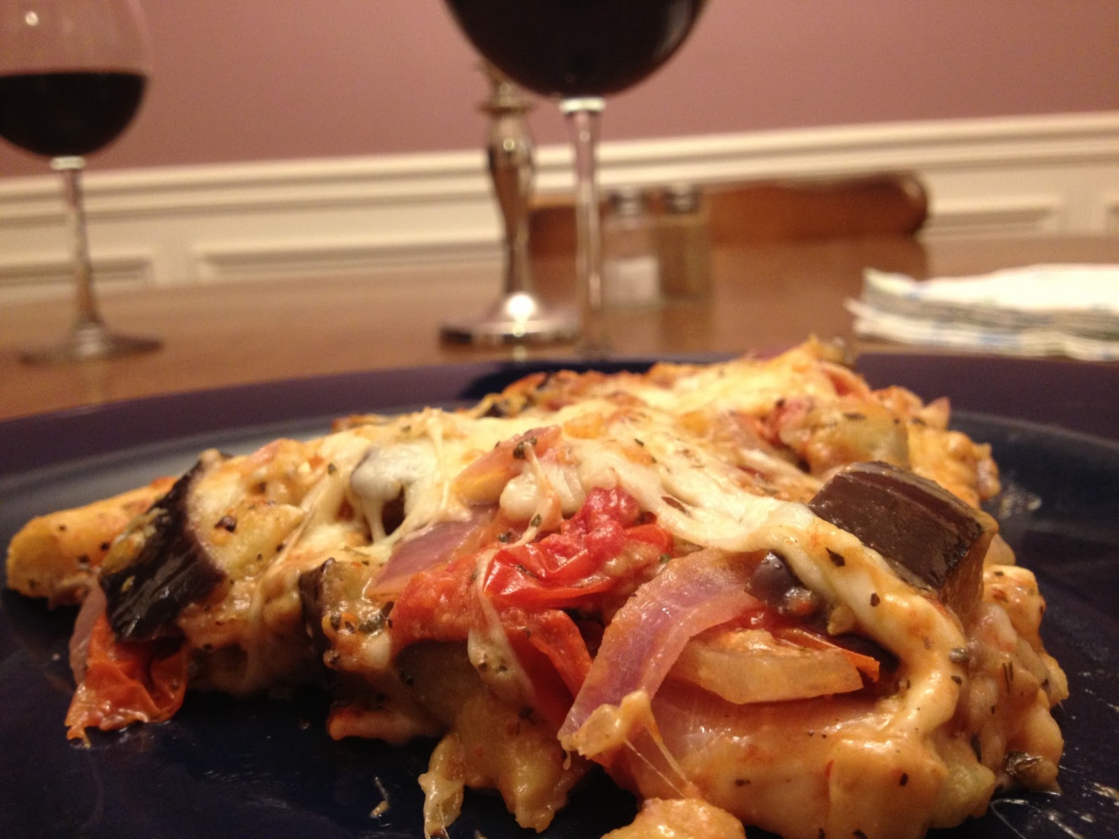 As for roasting the vegetables, I got a pretty large eggplant, so I ended up having to do my roasting in two different sessions because I didn't have enough room on my roasting pan. I roasted the eggplant first, then roasted the tomatoes and onion together next. If you aren't a huge fan of hot/spicy things, I would reduce the amount of red pepper flakes. I added a teaspoon, which at the time didn't seem like a whole lot, but I ended up needing a glass of milk by the end of dinner because my mouth was on fire. I don't have as high of a tolerance as other people though. I would suggest only using 1/2 teaspoon red pepper flakes in the recipe and then sprinkling more on top of your slice of pizza as you like. The roasted vegetables added a lot of flavor to the pizza. Overall, a great success! Enjoy!